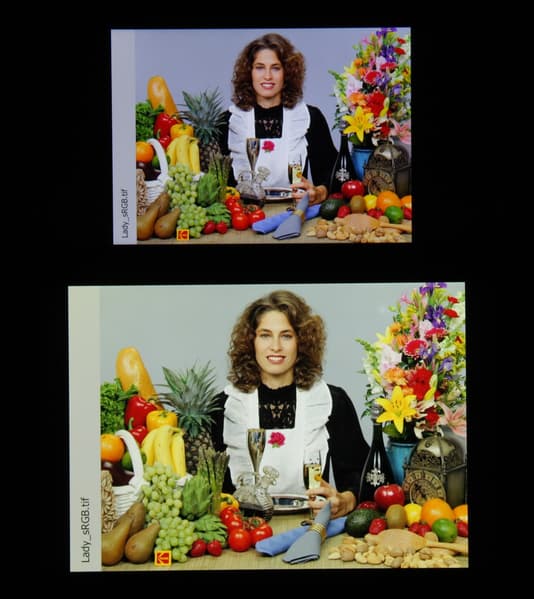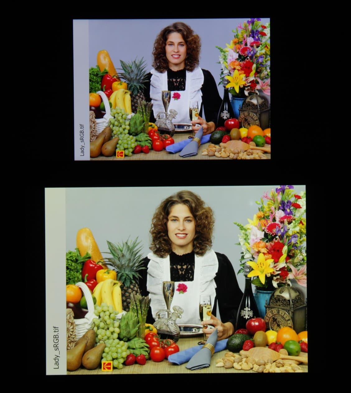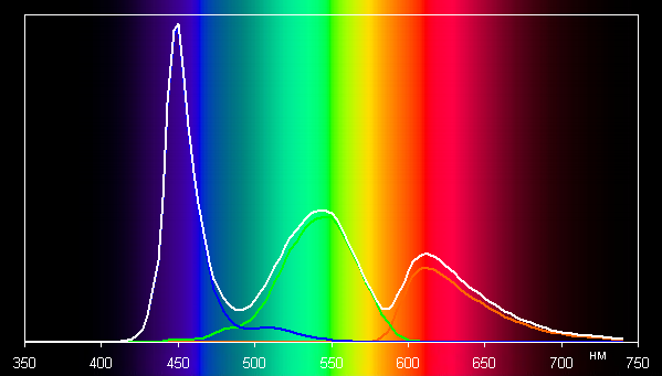 Спектры компонент достаточно хорошо разделены, что и обуславливает широкий цветовой охват. Для потребительского устройства широкий цветовой охват является недостатком, поскольку в итоге цвета изображений — рисунков, фотографий и фильмов, — ориентированных на пространство sRGB (а таких подавляющее большинство), имеют неестественную насыщенность. Особенно это заметно на узнаваемых оттенках, например на оттенках кожи. Результат приведен на фотографиях выше.