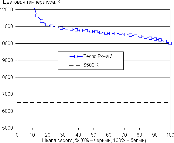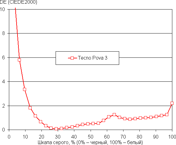 Баланс оттенков на шкале серого компромиссный, так как цветовая температура существенно выше стандартных 6500 К. Однако отклонение от спектра абсолютно черного тела (ΔE) на шкале серого ниже 3, что само по себе для потребительского устройства считается отличным показателем. При этом цветовая температура и ΔE мало изменяются от оттенка к оттенку — это положительно сказывается на визуальной оценке цветового баланса. (Самые темные области шкалы серого можно не учитывать, так как там баланс цветов не имеет большого значения, да и погрешность измерений цветовых характеристик на низкой яркости большая.)