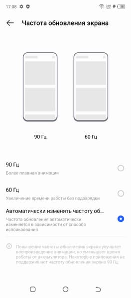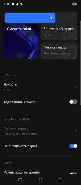 Контрастность (примерно в центре экрана) высокая — порядка 1100:1. Время отклика при переходе черный-белый-черный равно 17 мс (8,5 мс вкл. + 8,5 мс выкл.). Переход между полутонами серого 25% и 75% (по численному значению цвета) и обратно в сумме занимает 29 мс. В настройках экрана можно включить режим с повышенной до 90 Гц частотой обновления, что приводит как минимум к увеличению плавности прокрутки списков в меню.