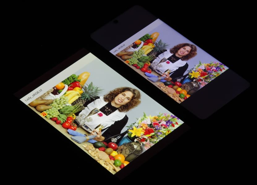 Цвета на экране смартфона немного перенасыщены, картинка затемнена, а цветовой баланс у экранов различается. Напомним, что фотография не может служить надежным источником сведений о качестве цветопередачи и приводится только для условной наглядной иллюстрации. Причина в том, что спектральная чувствительность матрицы фотоаппарата неточно совпадает с этой характеристикой человеческого зрения.