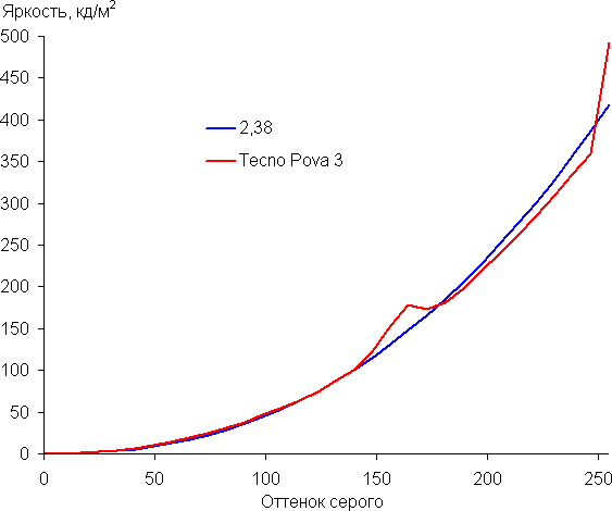 Построенная по 32 точкам с равным интервалом по численному значению оттенка серого гамма-кривая не выявила завала ни в светах, ни в тенях. Показатель аппроксимирующей степенной функции равен 2,38, что выше стандартного значения 2,2, потому и изображение затемнено. При этом реальная гамма-кривая существенно отклоняется от степенной зависимости: