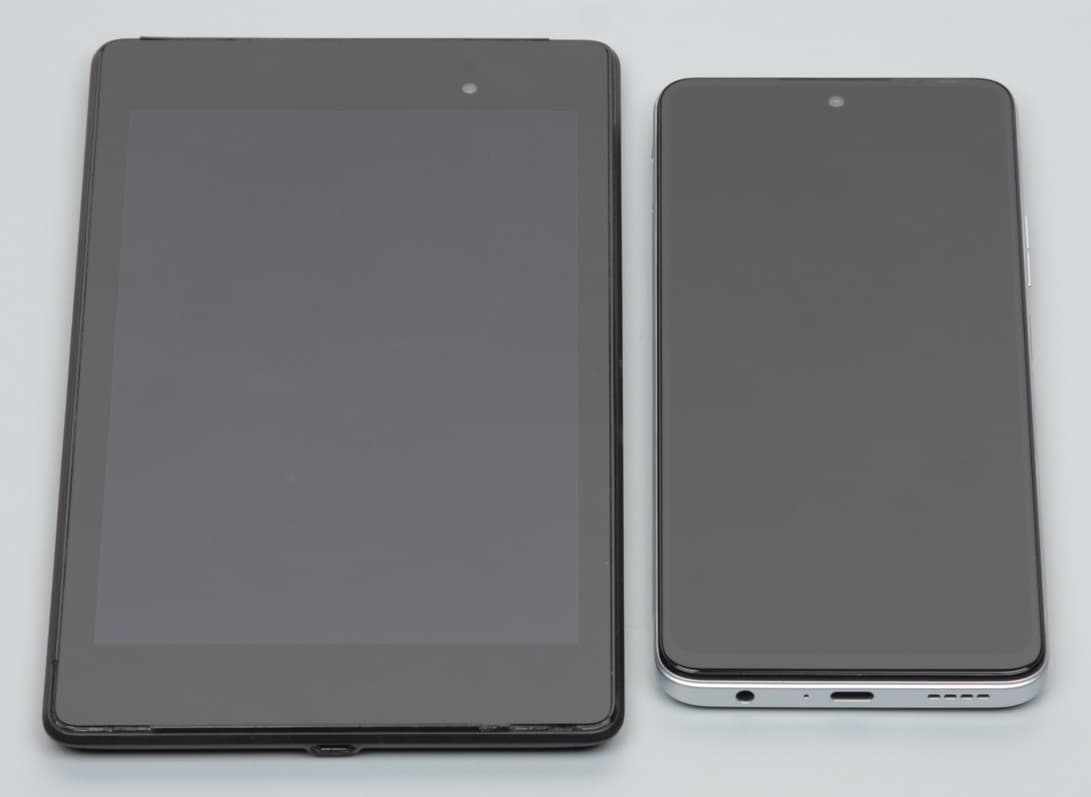 Лицевая поверхность экрана выполнена в виде стеклянной пластины с зеркально-гладкой поверхностью, устойчивой к появлению царапин. Судя по отражению объектов, антибликовые свойства экрана лучше, чем у экрана Google Nexus 7 (2013) (далее просто Nexus 7). Для наглядности приведем фотографию, на которой в выключенных экранах отражается белая поверхность (слева — Nexus 7, справа — Tecno Pova 3, далее их можно различать по размеру):