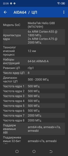 - SoC MediaTek Helio G88, 8 процессорных ядер (2×Cortex-A75 @2,0 ГГц + 6×Cortex-A55 @1,8 ГГц)