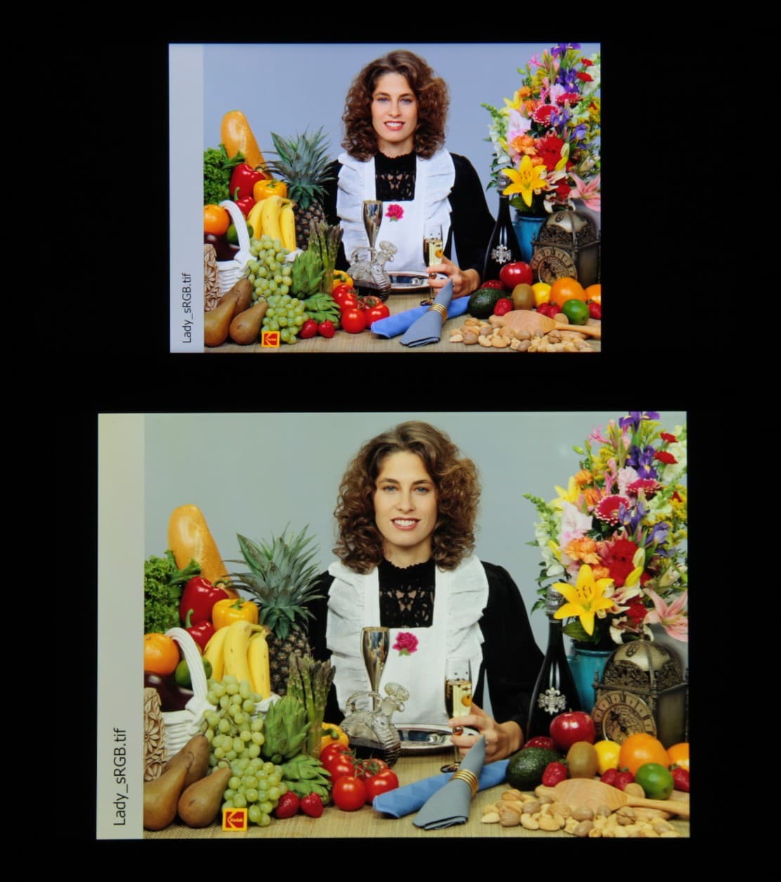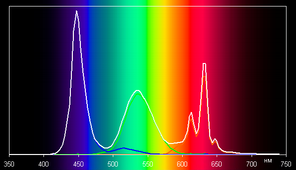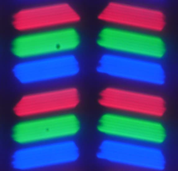 Спектры компонент достаточно хорошо разделены, что и обуславливает широкий цветовой охват. Для потребительского устройства широкий цветовой охват является недостатком, поскольку в итоге цвета изображений — рисунков, фотографий и фильмов, — ориентированных на пространство sRGB (а таких подавляющее большинство), имеют неестественную насыщенность. Особенно это заметно на узнаваемых оттенках, например на оттенках кожи. Результат приведен на фотографиях выше.