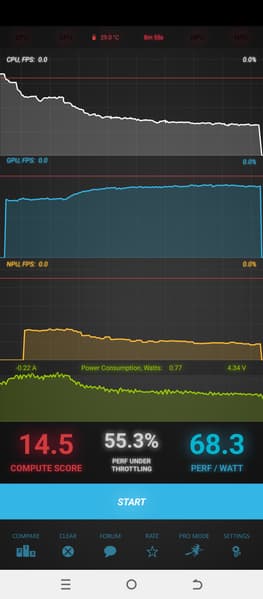 Тест на снижение производительности при нагреве мы проводим с помощью программы Burnout Benchmark, которая позволяет нагружать CPU, GPU и NPU: