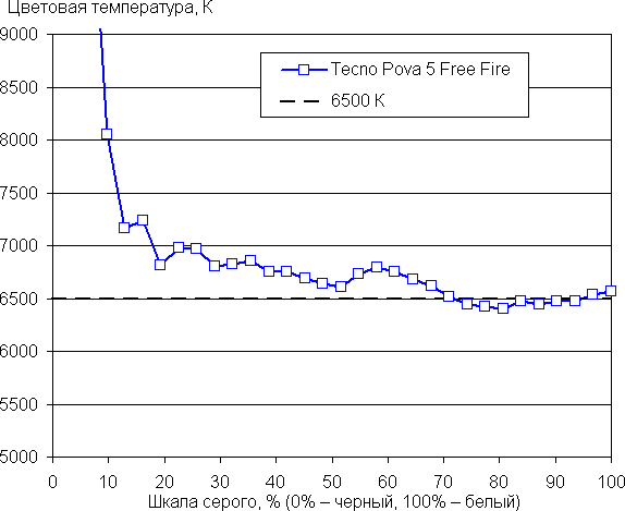 В принципе, яркий свет может приводить к нарушению суточного (циркадного) ритма (см. статью про iPad Pro с дисплеем 9,7 дюйма), но все решается снижением яркости до низкого, но еще комфортного уровня, а искажать цветовой баланс, уменьшая вклад синего, нет абсолютно никакого смысла. Эту настройку можно использовать для коррекции цветового баланса. Результат после ручной коррекции (ползунок как на снимке выше) хороший, так как цветовая температура становится достаточно близкой к стандартным 6500 К, а отклонение от спектра абсолютно черного тела (ΔE) остается ниже 10, что для потребительского устройства считается приемлемым показателем. При этом цветовая температура и ΔE мало изменяются от оттенка к оттенку — это положительно сказывается на визуальной оценке цветового баланса. (Самые темные области шкалы серого можно не учитывать, так как там баланс цветов не имеет большого значения, да и погрешность измерений цветовых характеристик на низкой яркости большая.)