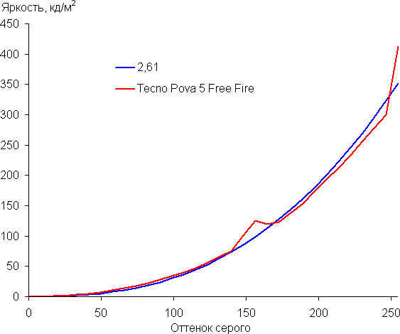 Построенная по 32 точкам с равным интервалом по численному значению оттенка серого гамма-кривая не выявила завала ни в светах, ни в тенях. Показатель аппроксимирующей степенной функции равен 2,61, что выше стандартного значения 2,2. При этом реальная гамма-кривая существенно отклоняется от степенной зависимости: