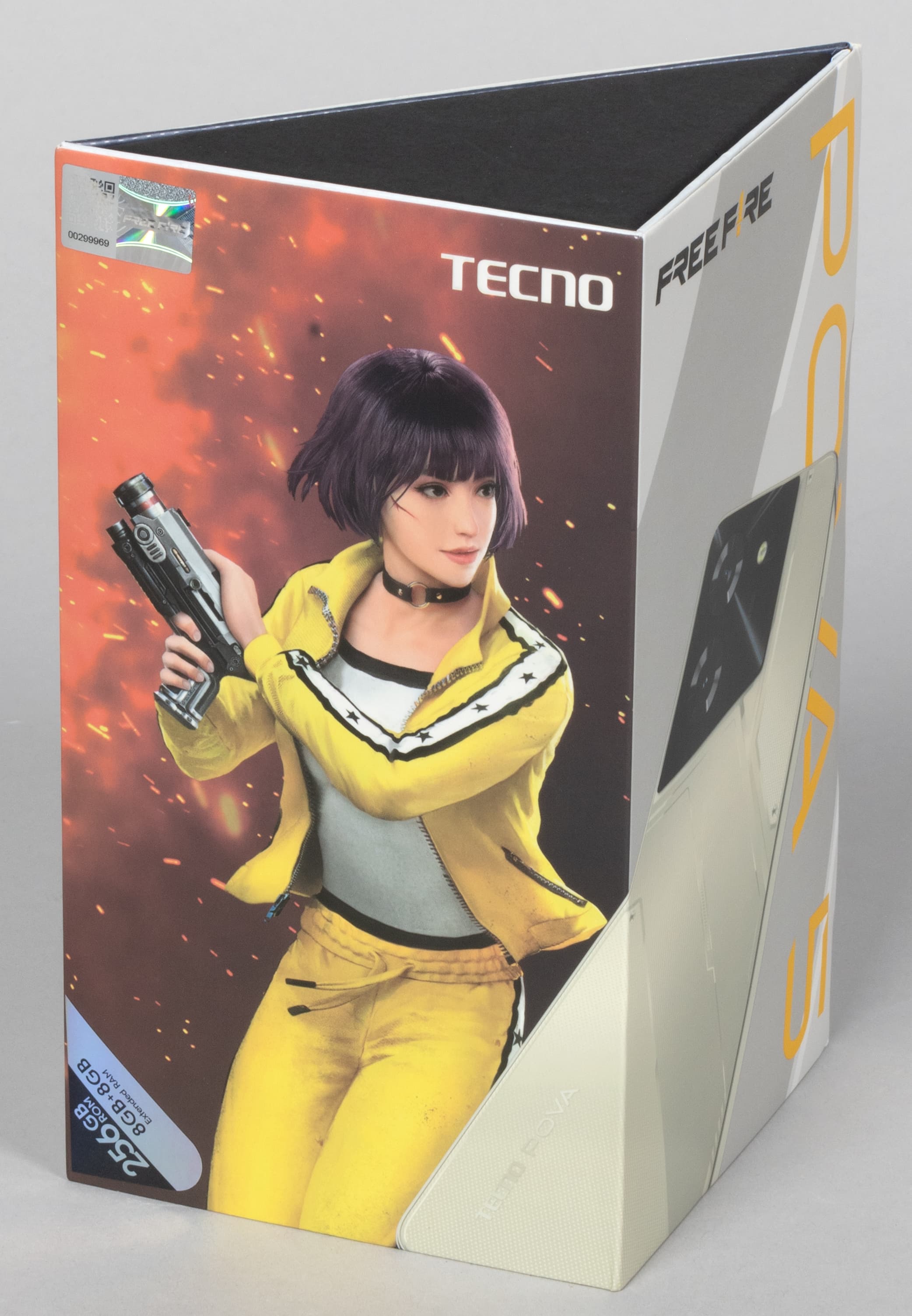 Смартфон Tecno Pova 5 Free Fire поставляется в картонной коробке очень необычной формы — треугольной призмы.