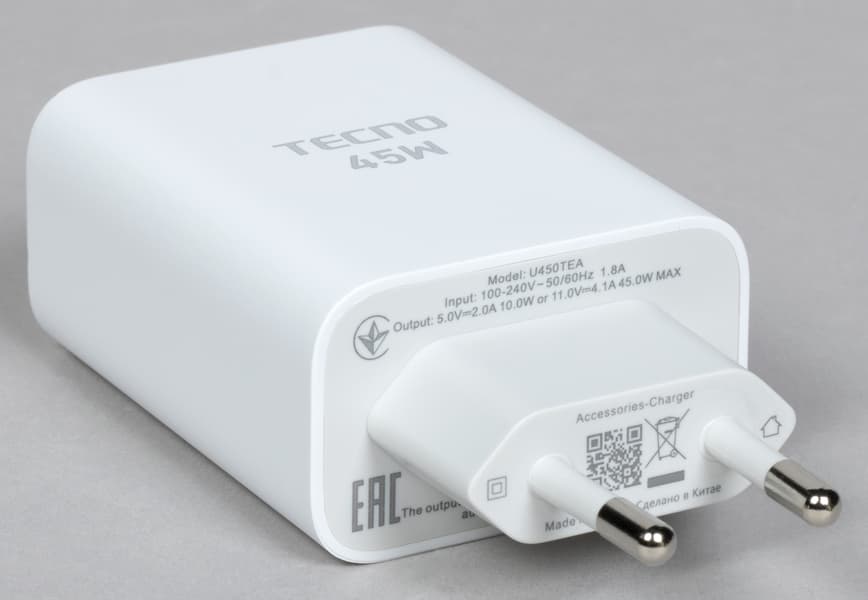 От комплектного сетевого зарядного устройства мощностью 45 Вт смартфон полностью заряжается в течение часа. Смартфон может реализовывать реверсивную зарядку другого устройства по кабелю мощностью до 10 Вт. Беспроводная зарядка не поддерживается.