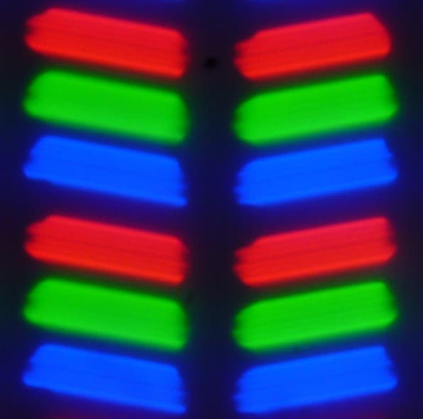 Спектры компонент достаточно хорошо разделены, что и обуславливает широкий цветовой охват. Для потребительского устройства широкий цветовой охват является недостатком, поскольку в итоге цвета изображений — рисунков, фотографий и фильмов, — ориентированных на пространство sRGB (а таких подавляющее большинство), имеют неестественную насыщенность. Особенно это заметно на узнаваемых оттенках, например на оттенках кожи. Результат приведен на фотографиях выше.