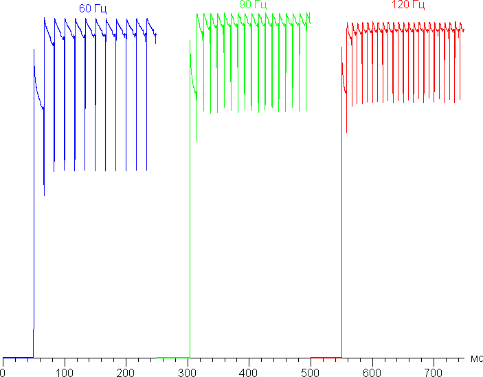В режимах 90 и 120 Гц плавность прокрутки заметно повышается. Посмотрим, изменится ли при этом характер модуляции. Режим с частотой обновления 90 Гц: