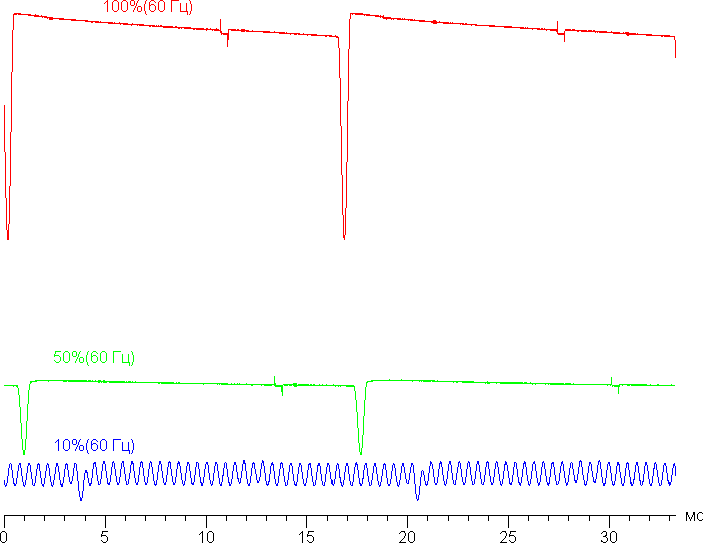На высоком и среднем уровне яркости присутствует значимая модуляция с частотой примерно 60, 90 или 120 Гц. На рисунках ниже приведены зависимости яркости (вертикальная ось) от времени (горизонтальная ось) для нескольких значений настройки яркости. Сначала для режима с частотой обновления 60 Гц: