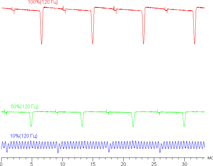 Частота модуляции на высокой и средней яркости увеличилась теперь уже до 120 Гц, а на низкой характер модуляции такой же, как и в случае частоты обновления 60 Гц. Уточним: видимого мерцания нет.