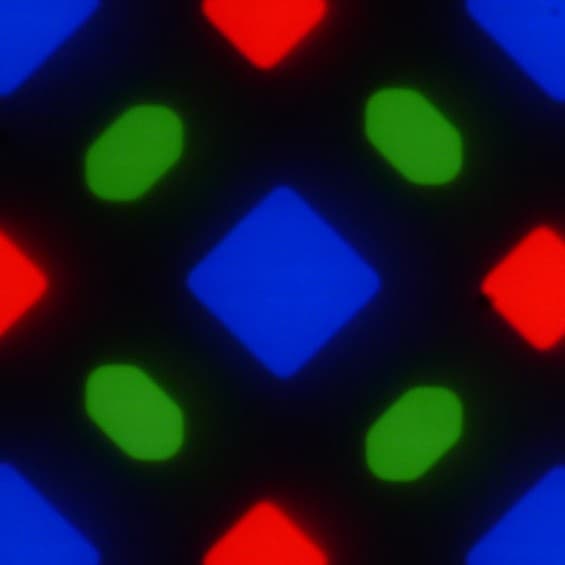 В этом экране используется матрица AMOLED — активная матрица на органических светодиодах. Полноцветное изображение создается с помощью субпикселей трех цветов — красного (R), зеленого (G) и синего (B), но красных и синих субпикселей в два раза меньше, что можно обозначить как RGBG. Это подтверждается фрагментом микрофотографии: