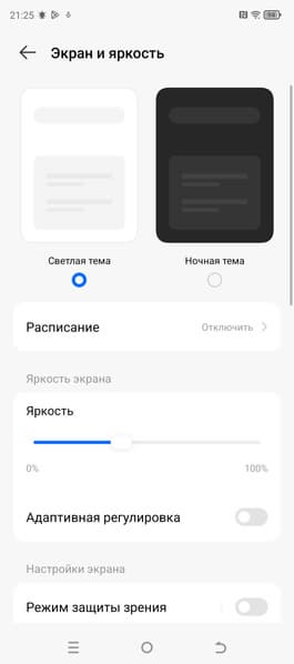 При ручном управлении яркостью и при выводе белого поля во весь экран максимальное значение яркости составило примерно 520 кд/м² в обычных условиях, на очень ярком свету при включенной опции Режим высокой яркости оно может повышаться до 960 кд/м². В любом случае максимальная яркость очень высокая. В данном случае чем меньше площадь белого на экране, тем он светлее, то есть фактическая максимальная яркость белых участков будет почти всегда еще выше. В итоге, учитывая отличные антибликовые свойства, читаемость днем на солнце, должна быть на приемлемом уровне, а темная тема не только экономит заряд аккумулятора, но способствует лучшей разборчивости информации на экране в условиях высокой освещенности. Минимальное значение яркости при ручном управлении — 2 кд/м², то есть пониженный уровень яркости без проблем позволяет использовать устройство даже в полной темноте. Есть автоматическая регулировка яркости по датчику освещенности (он находится на фронтальной панели близко к ее верхнему краю правее решетки фронтального громкоговорителя). В автоматическом режиме при изменении внешних условий освещенности яркость экрана как повышается, так и понижается. Работа этой функции зависит от положения ползунка регулировки яркости: им пользователь может попытаться выставить желаемый уровень яркости в текущих условиях. Если оставить все по умолчанию, то в полной темноте функция автояркости уменьшает яркость до 2 кд/м² (очень темно), в условиях освещенного искусственным светом офиса (примерно 550 лк) устанавливает на 140 кд/м² (нормально), а условно под прямыми лучами солнца повышает до 960 кд/м² (до максимума, так и нужно). Результат по умолчанию нас не удовлетворил, поэтому мы попробовали повысить яркость в полной темноте. Яркость стала выше, но после цикла повышения внешней освещенности и ее снижения, все вернулось к тем же значениям, что были до вмешательства. Получается, что функция автоподстройки яркости работает более-менее адекватно, но не позволяет пользователю настраивать свою работу под индивидуальные требования.