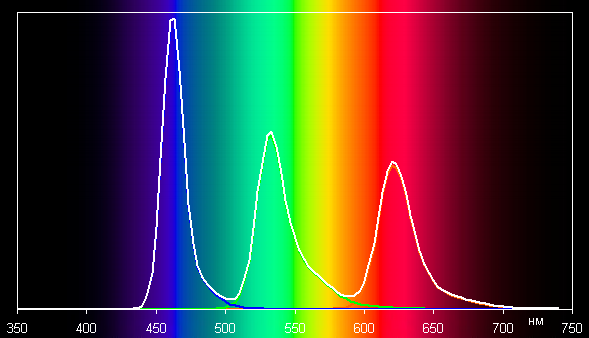В первом случае спектры компонент (то есть спектры чистых красного, зеленого и синего цветов) очень хорошо разделены: