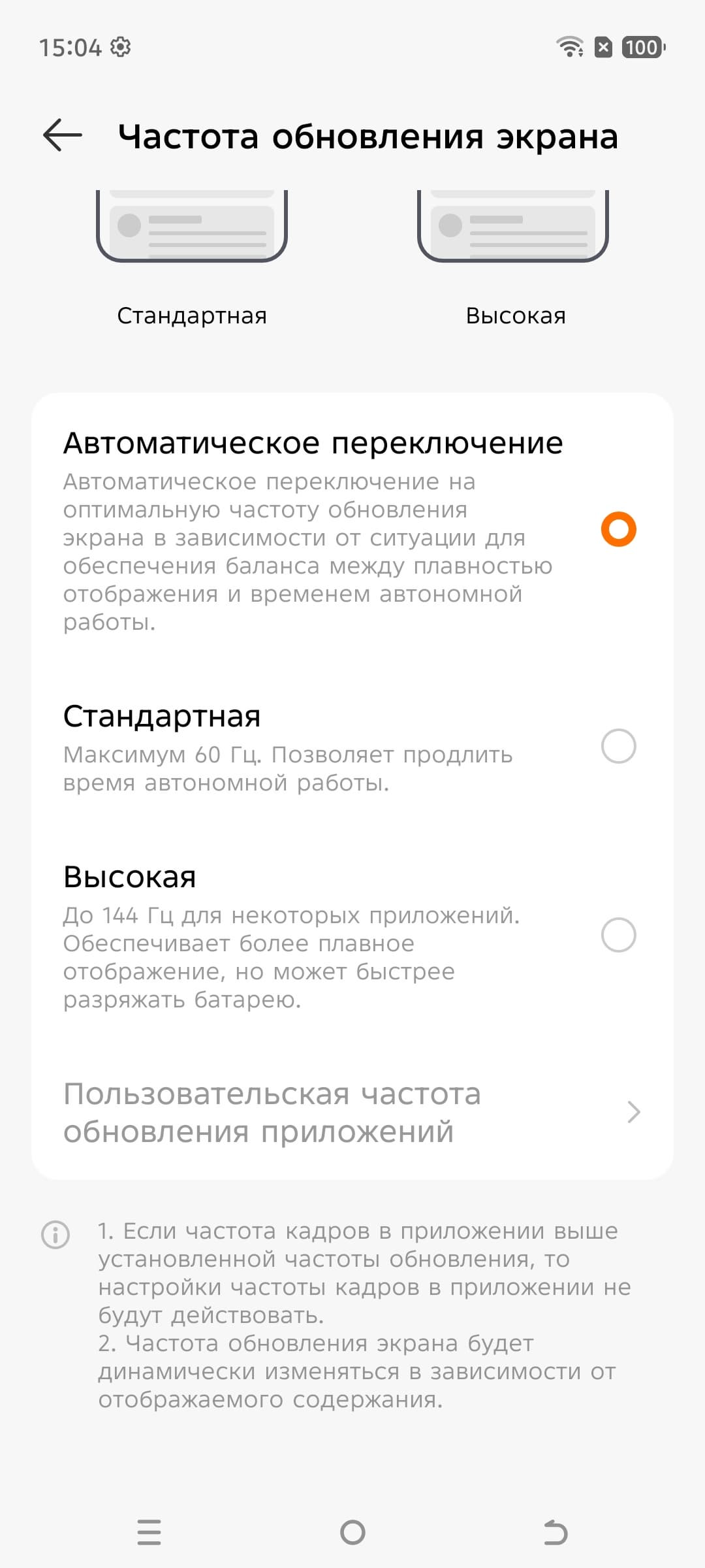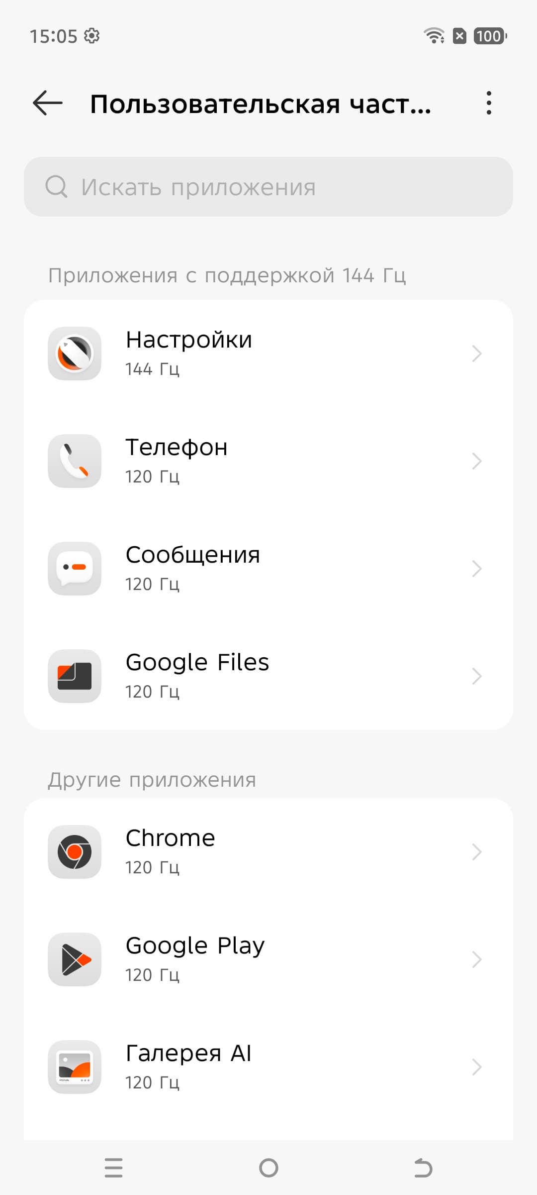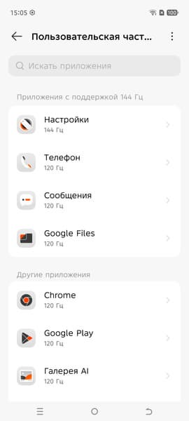 В настройках экрана можно включить режим с повышенной до 144 Гц частотой обновления. По факту частота обновления повышается максимум до 120 Гц почти во всех установленных приложениях, за исключением штатного приложения Настройки и еще в трех приложениях: