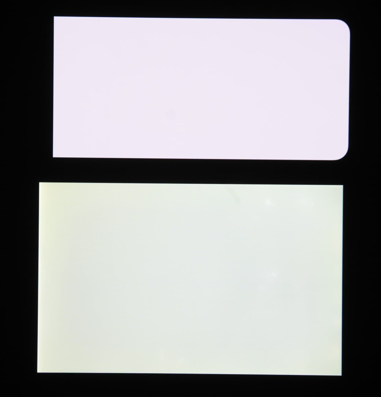 Экран характеризуется великолепными углами обзора. Яркость под углом у двух экранов (если сравнивать еще и с Nexus 7) уменьшается, но в случае смартфона падение яркости выражено гораздо меньше. В итоге, даже если установить формально одинаковую яркость, экран этого смартфона визуально выглядит гораздо более ярким (в сравнении с ЖК-экранами), так как на экран мобильного устройства часто приходится смотреть как минимум под небольшим углом. Правда, белый цвет при отклонении на большие углы приобретает легкий синеватый оттенок. Черный цвет у смартфона остается просто черным под любыми углами. Он настолько черный, что параметр контрастности в данном случае неприменим. Для сравнения приведем фотографии, на которых на экран смартфона и экран второго участника (Nexus 7; снизу — Nexus 7, сверху — смартфон) выведены одинаковые изображения, при этом яркость экранов изначально установлена примерно на 200 кд/м², а цветовой баланс на фотоаппарате принудительно переключен на 6500 К.