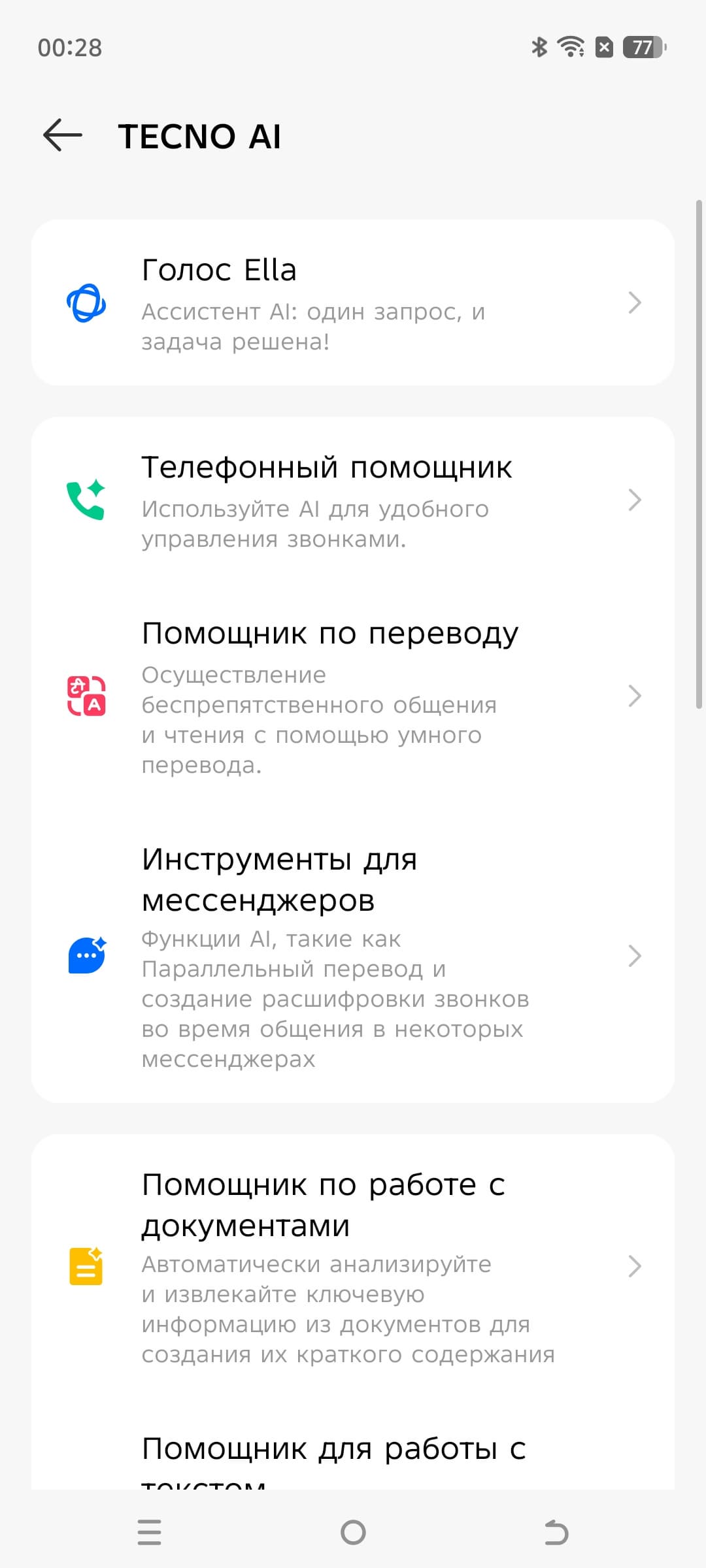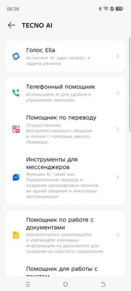 Интерфейс предоставляет доступ к широкому набору ИИ-функций во главе с фирменным умным голосовым помощником Ella (аналог Алисы), который поможет ответить на многие вопросы. Ставшие уже стандартными инструменты для редактирования фотографий, для перевода телефонных разговоров «на ходу», для расшифровки аудиозаписей — на месте.