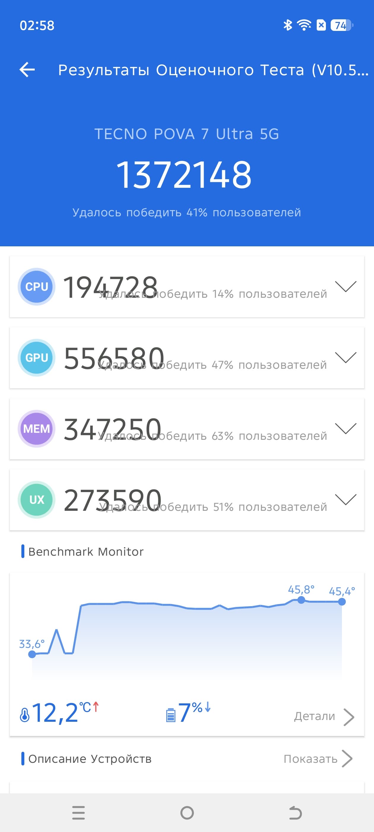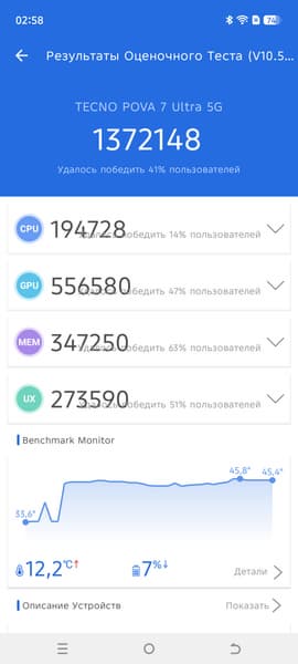 Tecno Pova 7 Ultra 5G работает на SoC Mediatek Dimensity 8350 Ultimate, которая производится по нормам 4-нанометрового техпроцесса. Это SoC высокого уровня, истинно субфлагманская. С ней смартфон набирает в AnTuTu почти 1,4 млн баллов. Это одно из явных преимуществ данной модели: субфлагманский процессор установлен в сравнительно недорогой смартфон. Такой производительности с лихвой хватает для выполнения абсолютно любых задач, включая видеосъемку в 4К@60 fps. С требовательными играми аппарат также справляется на высоких настройках. Смартфон очень мощный.