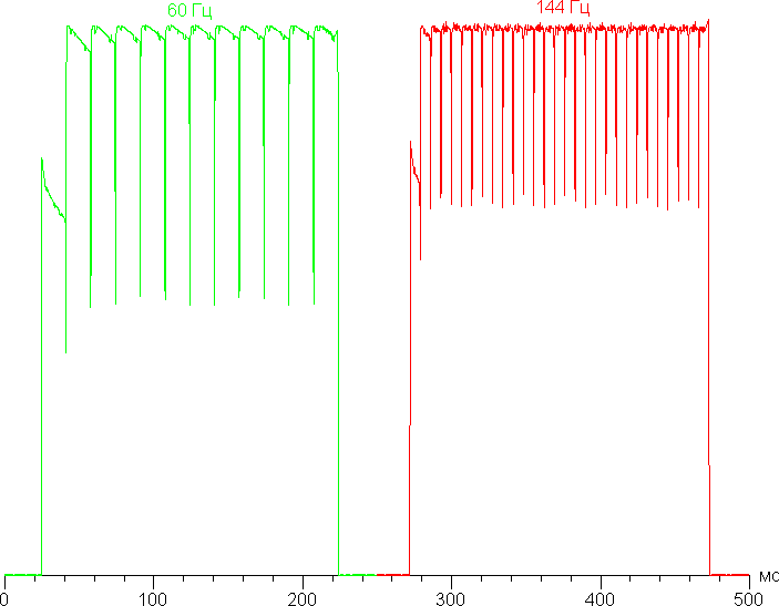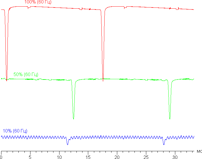 На любом уровне яркости присутствует значимая модуляция с частотой 60, 120 или 144 Гц. На рисунках ниже приведены зависимости яркости (вертикальная ось) от времени (горизонтальная ось) для нескольких значений настройки яркости. Сначала для режима с частотой обновления 60 Гц: