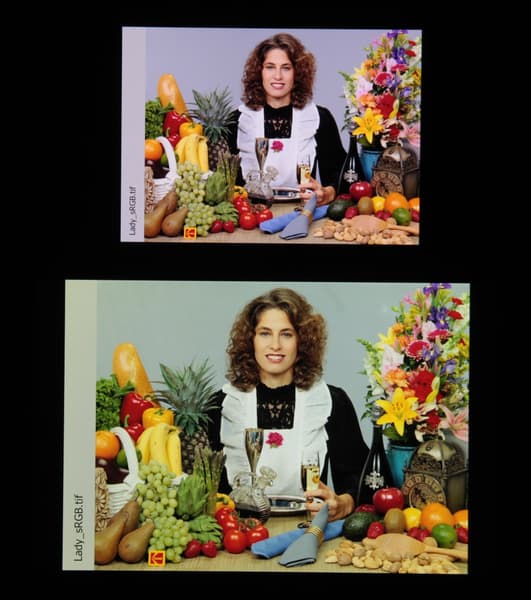 Соответственно, цветовой охват в случае изображения с профилем sRGB при выбранном профиле Яркие цвета и при выводе в ПО Галерея AI шире sRGB и слегка искажен: