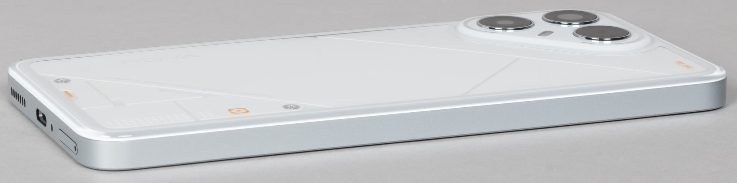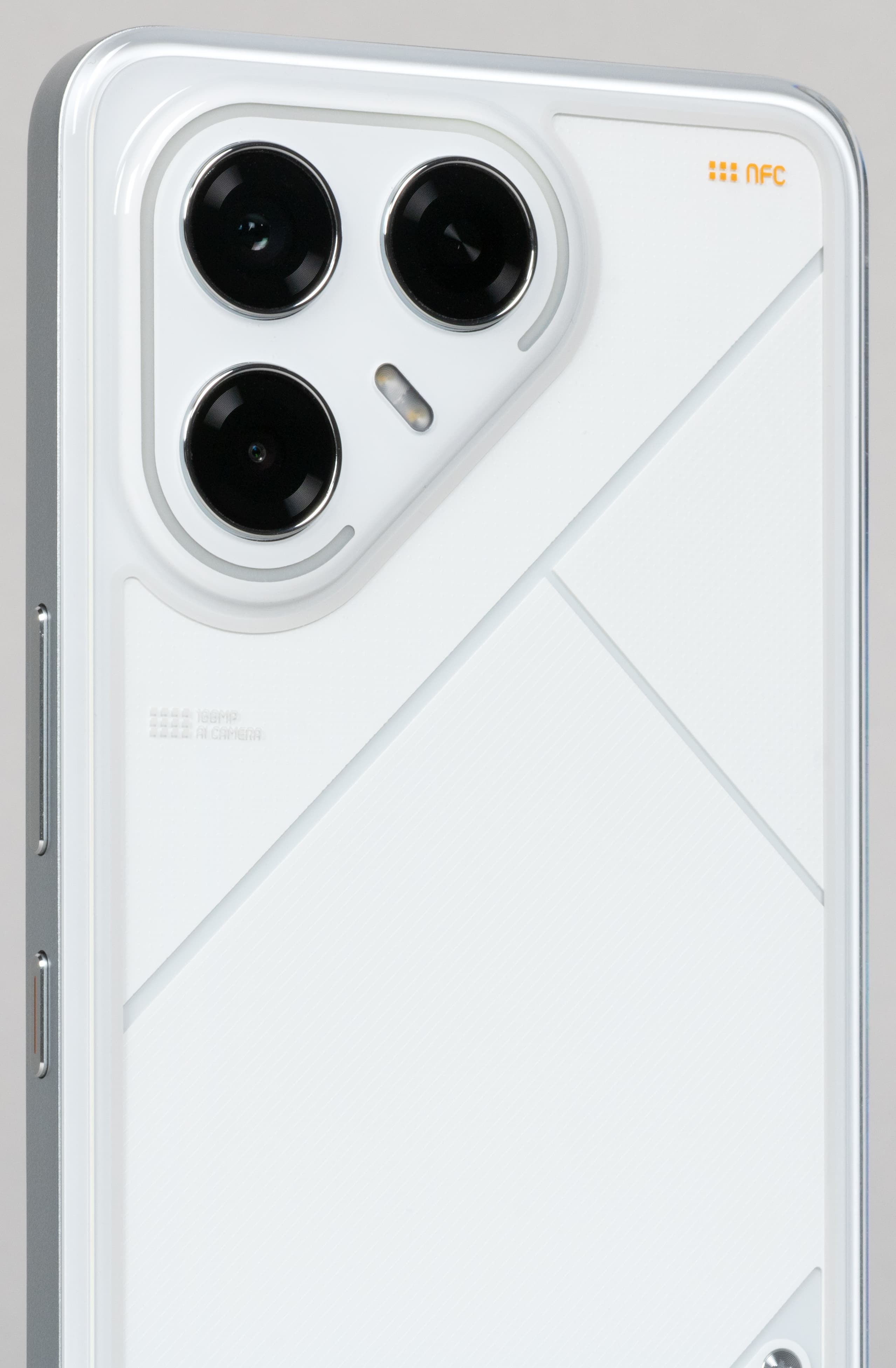 Кружки камер и вспышка объединены в блок треугольной формы с закругленными углами. Блок имеет общий цвет с цветом корпуса, поэтому визуально облегчает дизайн, делает выступающий элемент менее броским. Вокруг блока проложена светодиодная полоса, которая разнообразными пульсирующими и прерывистыми световыми сигналами реагирует на уведомления, звонки, зарядку и даже игровой процесс. Разработчик назвал эту функцию «Сигнальным глифом».