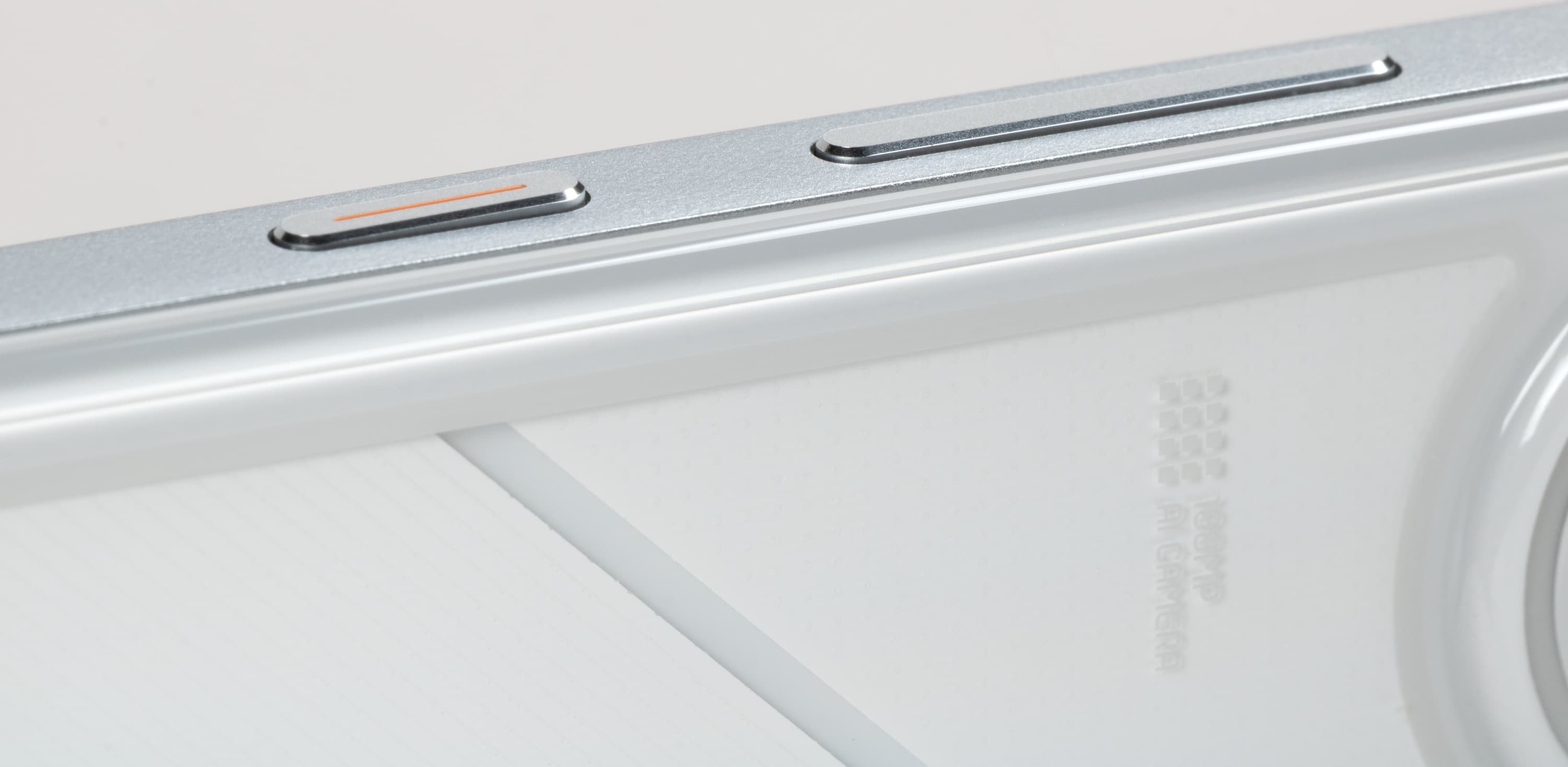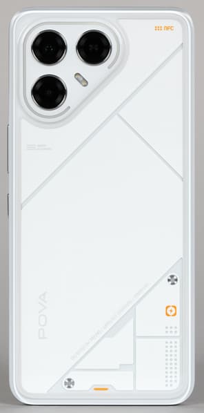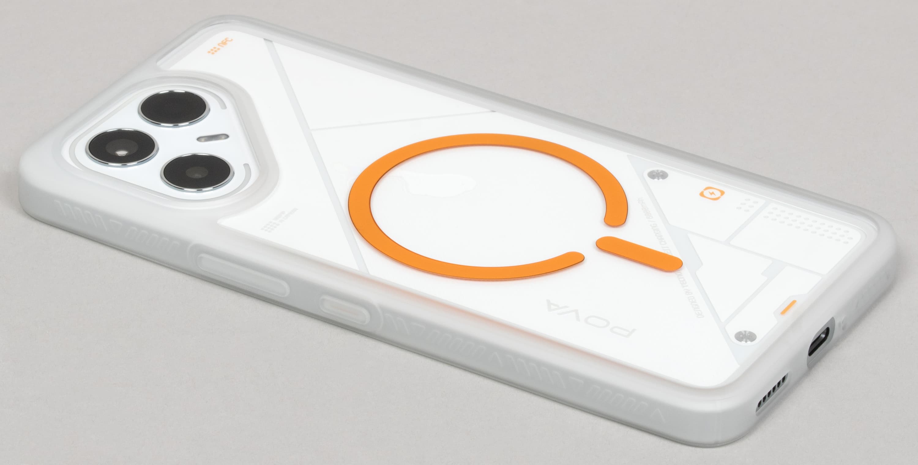 Tecno Pova 7 Ultra 5G оформлен необычным образом со спинкой, украшенной элементами, имитирующими металлические детали и панели в техногенном стиле. Правда, все эти детали оформления на ощупь не почувствовать, поскольку подложка полностью прикрыта сверху слоем гладкого прозрачного пластика.
