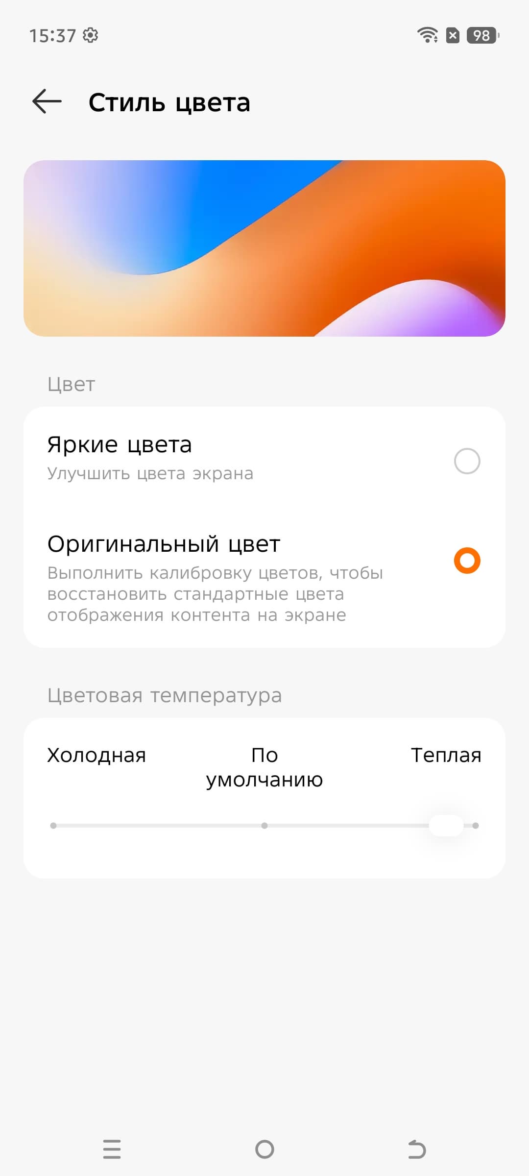 Отметим, что на экранах с уширенным цветовым охватом (без соответствующей коррекции) цвета́ обычных изображений, оптимизированных для устройств sRGB, выглядят неестественно насыщенными. Отсюда и рекомендация: в большинстве случаев смотреть кино, фотографии и все естественное лучше при выборе профиля Оригинальный цвет с использованием штатной программы Галерея AI. Но не исключено, что есть и другие программы, которые могут корректировать цветовой охват в соответствии с возможностями экрана.