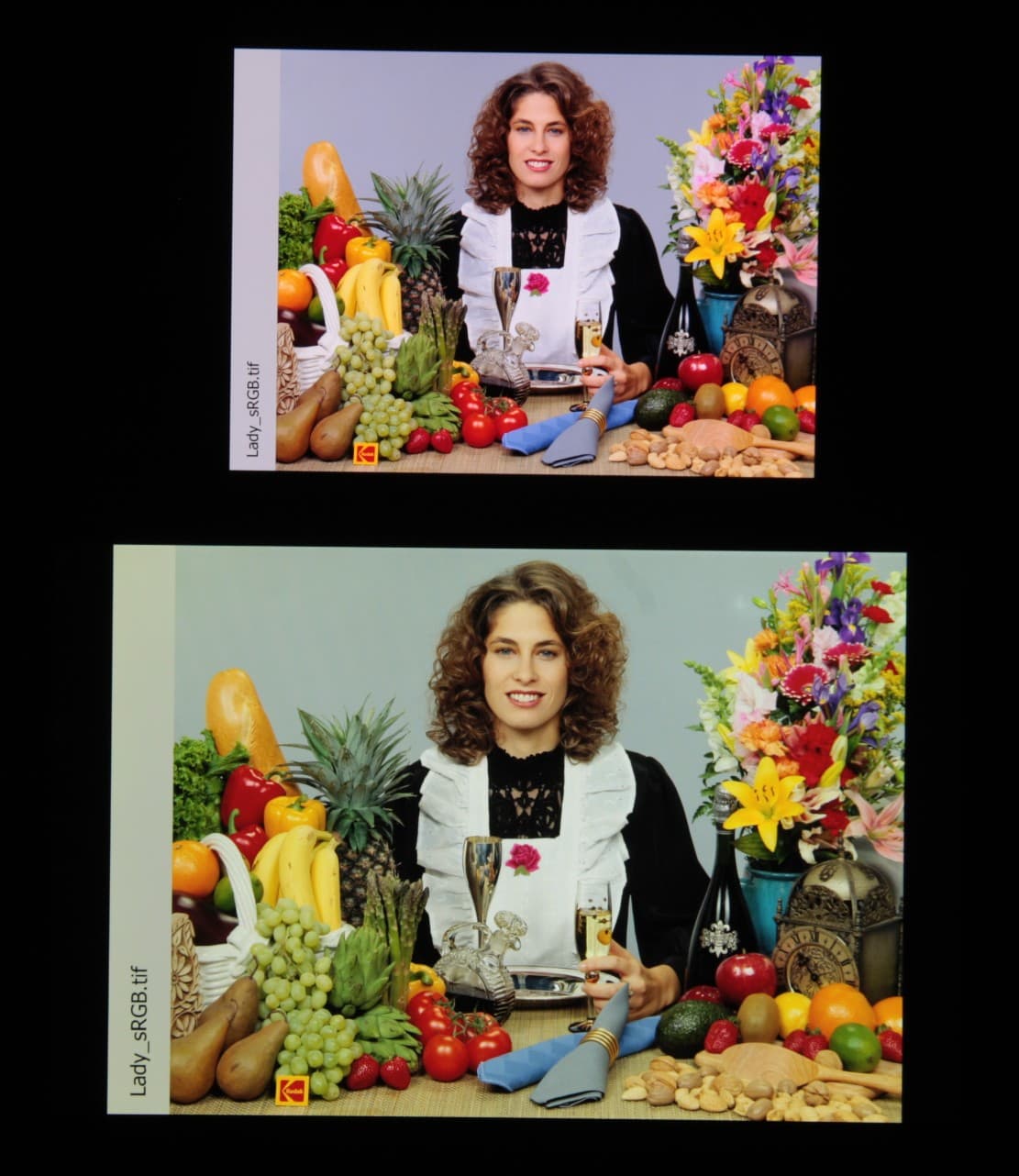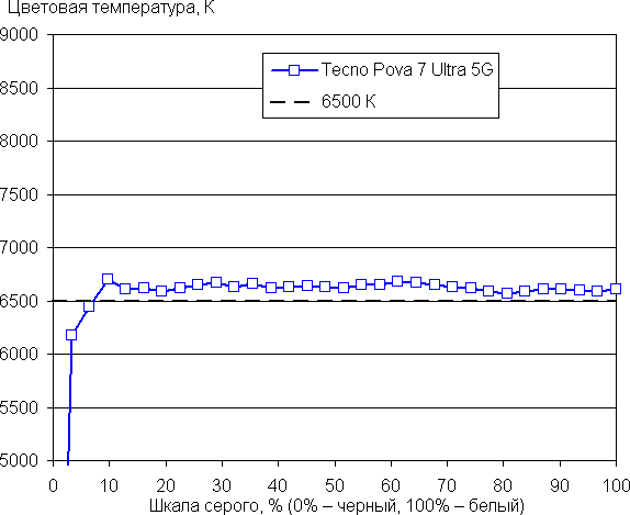 Баланс оттенков на шкале серого компромиссный, так как цветовая температура существенно выше стандартных 6500 К порядка 7900 К (отклонение от спектра абсолютно черного тела (ΔE) при этом 1,5 единицы). Однако в этом устройстве есть возможность скорректировать цветовой баланс регулировкой цветовой температуры. После коррекции (ползунок как на снимке выше) удается снизить цветовую температуру, сохранив ΔE ниже 10 единиц, что для потребительского устройства считается приемлемым показателем. При этом цветовая температура и ΔE мало изменяются от оттенка к оттенку — это положительно сказывается на визуальной оценке цветового баланса:
