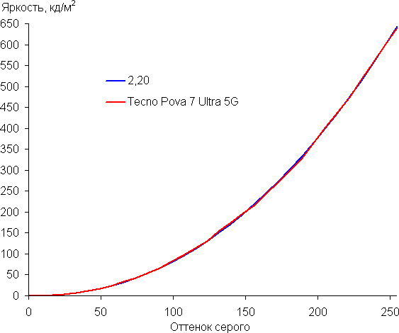 Напомним, что в случае OLED-экранов яркость фрагментов изображения динамично меняется в соответствии с характером выводимого изображения — слегка уменьшается для светлых в целом изображений. В итоге полученная зависимость яркости от оттенка (гамма-кривая), скорее всего, немного не соответствует гамма-кривой статичного изображения, так как измерения проводились при последовательном выводе оттенков серого почти на весь экран.