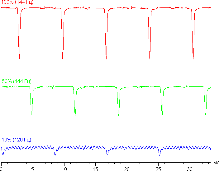 Видно, что основная частота модуляции на высокой и средней яркости увеличилась до 144 Гц, но на низкой яркости только до 120 Гц. Видимого мерцания всё так же нет.