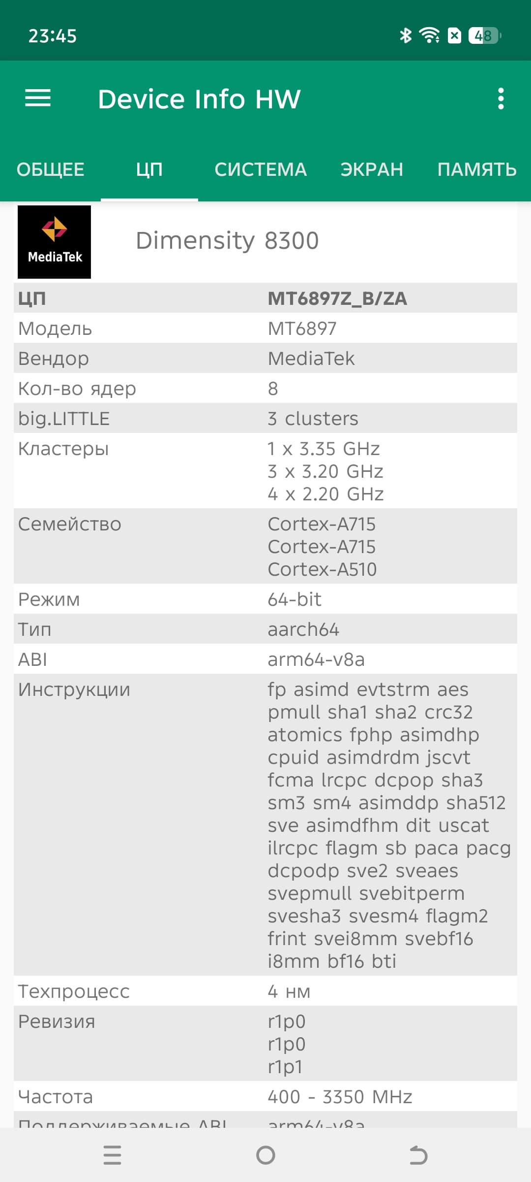 - SoC Mediatek Dimensity 8350 Ultimate, 8 процессорных ядер (1×Cortex-A715 @3,35 ГГц + 3×Cortex-A715 @3,20 ГГц + 4×Cortex-A510 @2,20 ГГц)