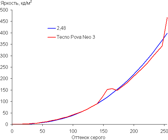 Построенная по 32 точкам с равным интервалом по численному значению оттенка серого гамма-кривая не выявила завала ни в светах, ни в тенях. Показатель аппроксимирующей степенной функции равен 2,48, что выше стандартного значения 2,2. При этом реальная гамма-кривая существенно отклоняется от степенной зависимости: