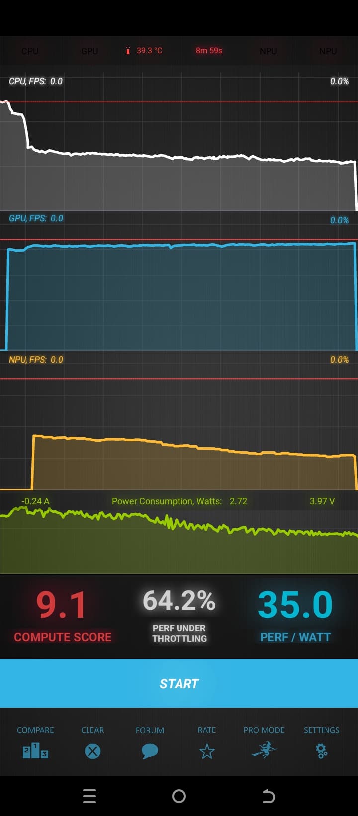 Тест на снижение производительности при нагреве мы проводим с помощью программы Burnout Benchmark, которая позволяет нагружать CPU, GPU и NPU:
