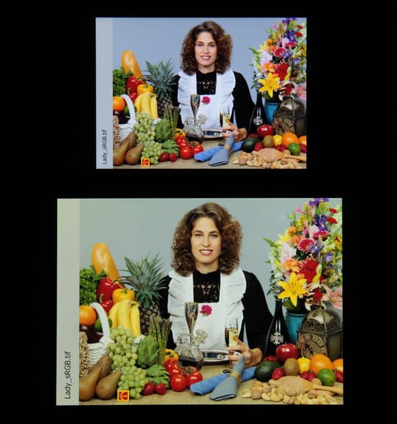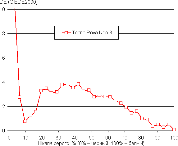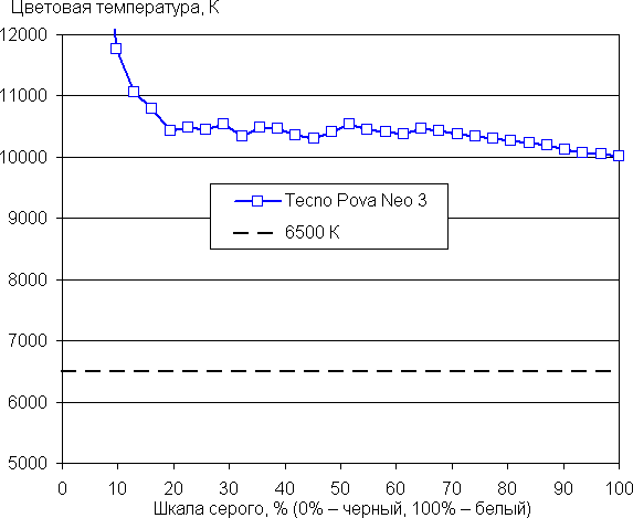 Баланс оттенков на шкале серого компромиссный, так как цветовая температура существенно выше стандартных 6500 К. Однако отклонение от спектра абсолютно черного тела (ΔE) на шкале серого ниже 10 единиц, что для потребительского устройства считается приемлемым показателем. При этом цветовая температура и ΔE мало изменяются от оттенка к оттенку — это положительно сказывается на визуальной оценке цветового баланса: