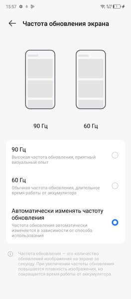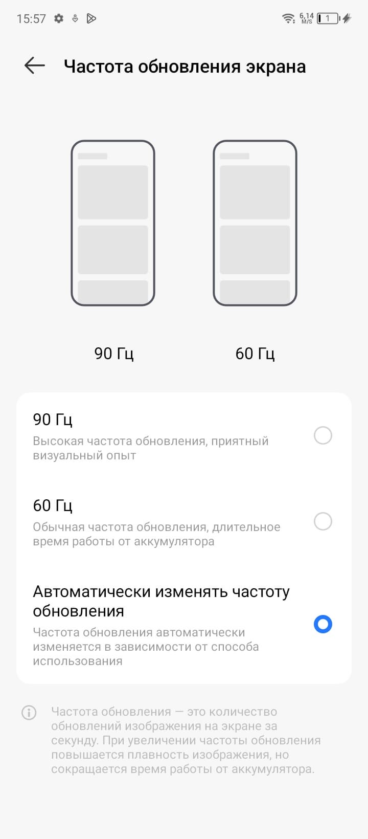 В настройках экрана можно включить режим с повышенной до 90 Гц частотой обновления, что приводит как минимум к увеличению плавности прокрутки списков в меню.