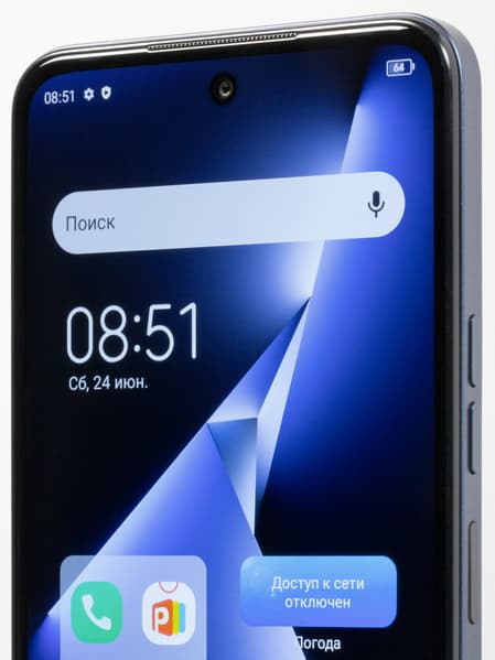 Экран смартфона имеет хорошие углы обзора без значительного сдвига цветов даже при больших отклонениях взгляда от перпендикуляра к экрану и без инвертирования оттенков. Черное поле при отклонении по диагонали высветляется сильно, но остается условно нейтрально-серым (так видно глазами).