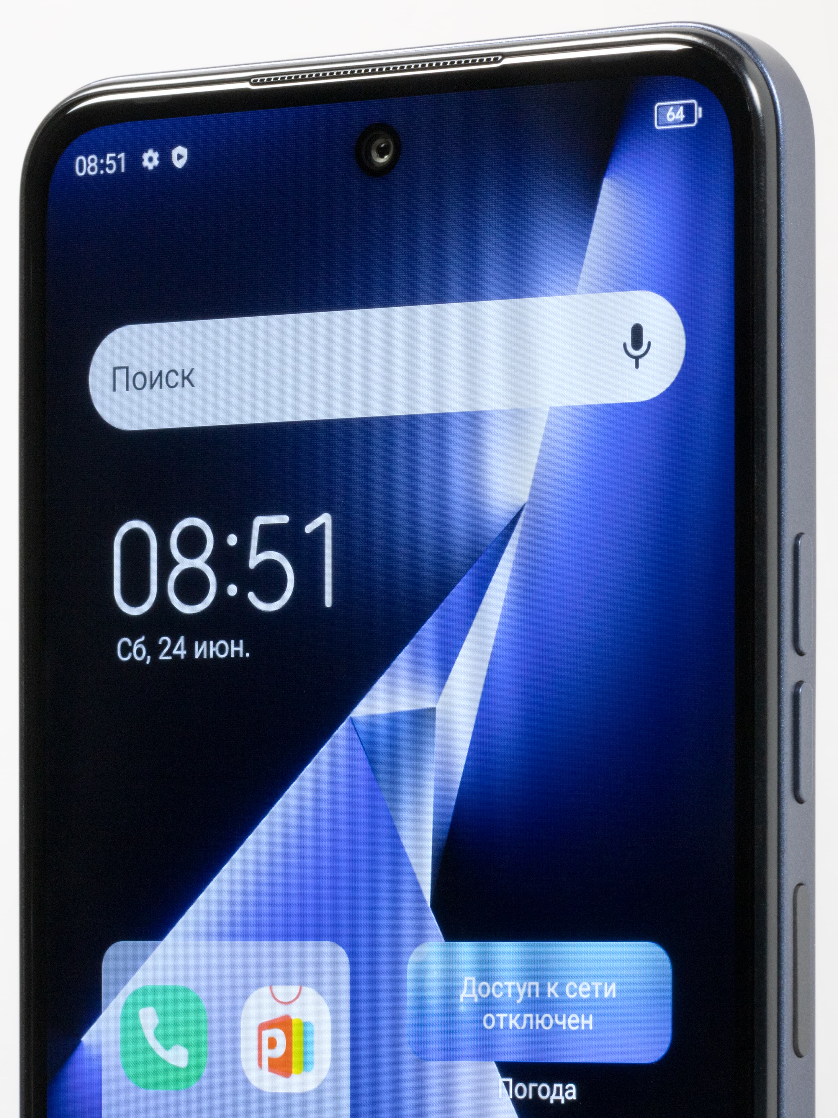 Фронтальная камера спрятана за круглым вырезом в матрице экрана сверху по центру.