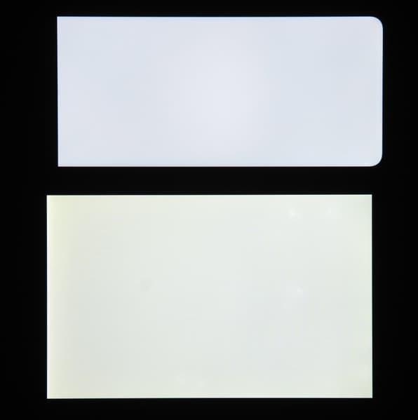 Яркость под углом у экранов уменьшилась (как минимум в 5 раз, исходя из разницы в выдержке), но в случае смартфона яркость снизилась меньше. Черное поле при отклонении по диагонали сильно высветляется и приобретает фиолетовый оттенок. Фотографии ниже это демонстрируют (яркость белых участков в перпендикулярном плоскости экранов направлении одинаковая!):
