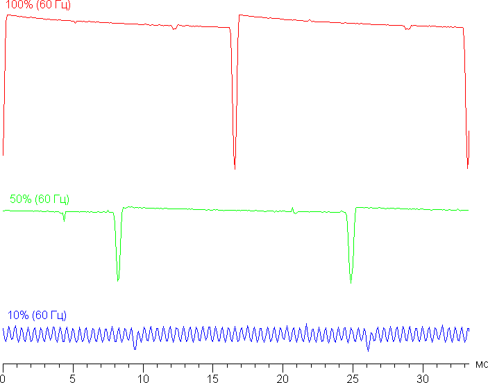 На высоком и среднем уровне яркости присутствует значимая модуляция с частотой примерно 60 или 120 Гц. На рисунках ниже приведены зависимости яркости (вертикальная ось) от времени (горизонтальная ось) для нескольких значений настройки яркости. Сначала для режима с частотой обновления 60 Гц: