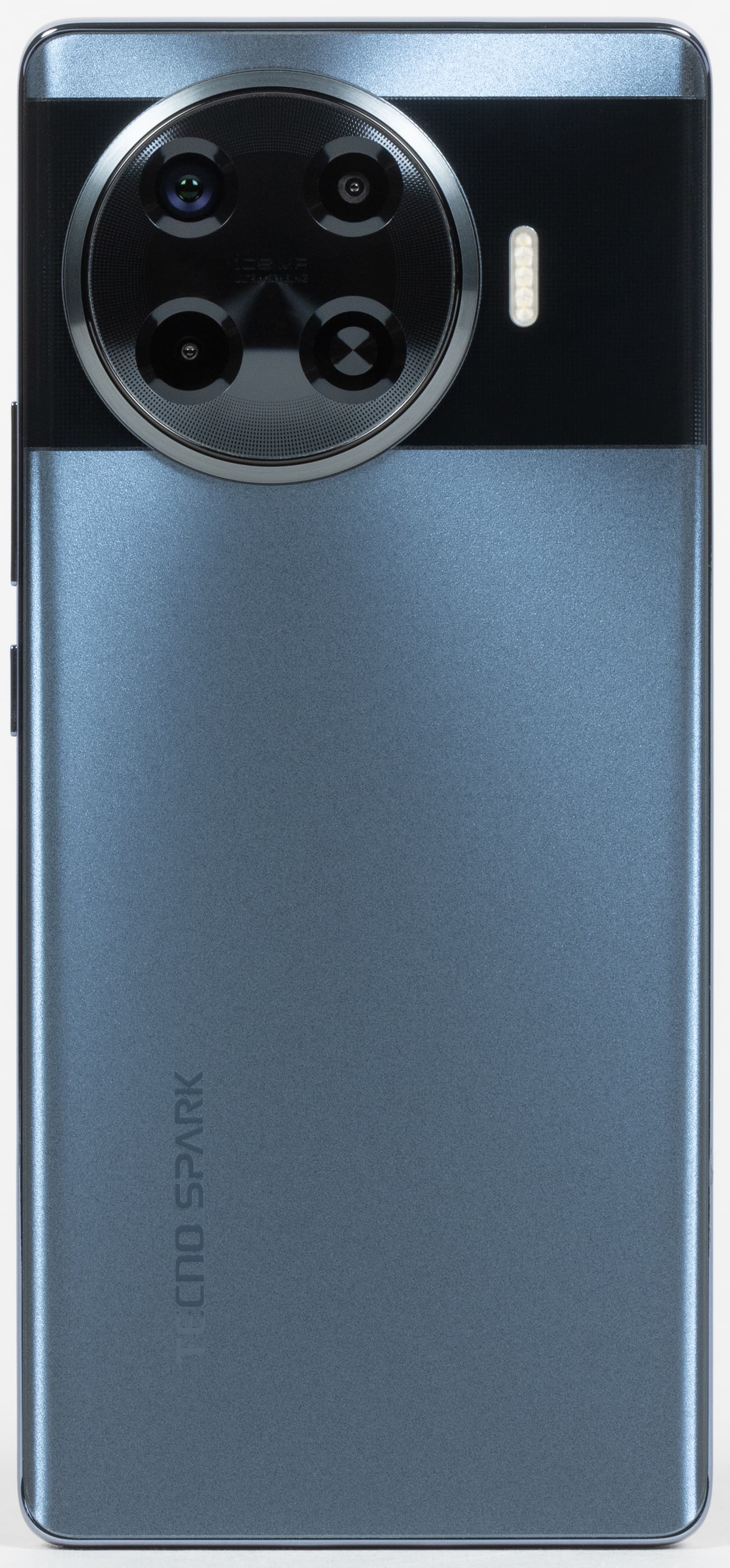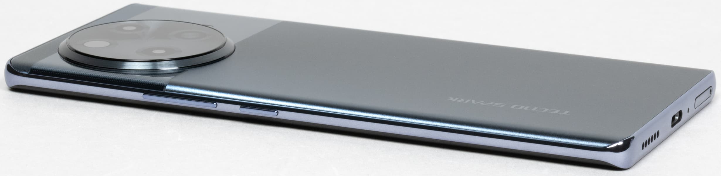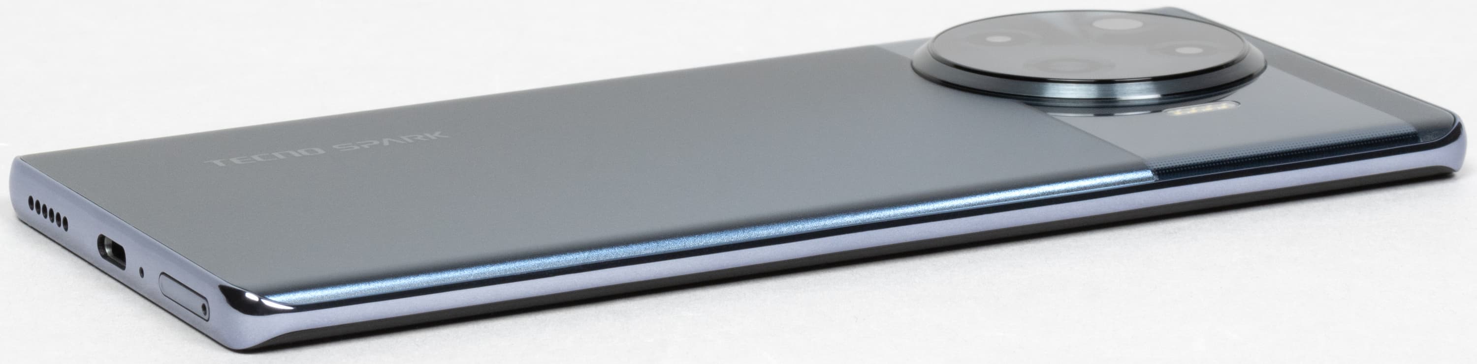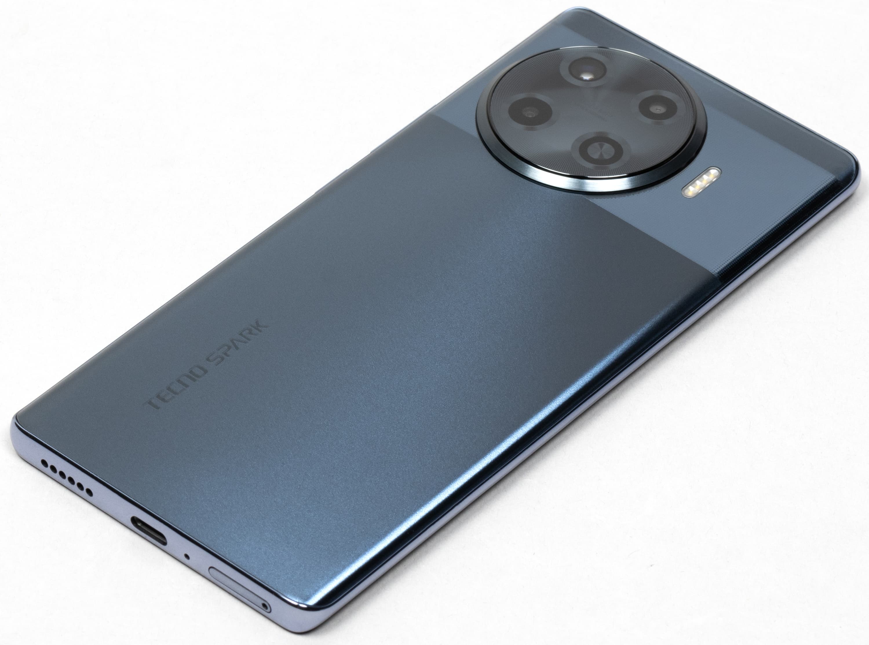 Tecno Spark 20 Pro+ выполнен в старомодном утонченном и обтекаемом дизайне с сильно зауженными боковинами и загнутым стеклом экрана-«водопада», который раньше был отличительным признаком топовых флагманов, а теперь активно используется в среднем сегменте. Смартфон скользкий, ухватиться не за что, поскольку боковые грани скользкой рамки заужены до минимума, буквально заострены.