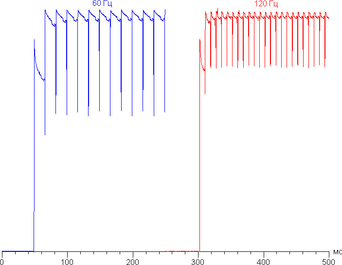 В режиму 120 Гц плавность прокрутки заметно повышается. Посмотрим, изменится ли при этом характер модуляции. Режим с частотой обновления 120 Гц: