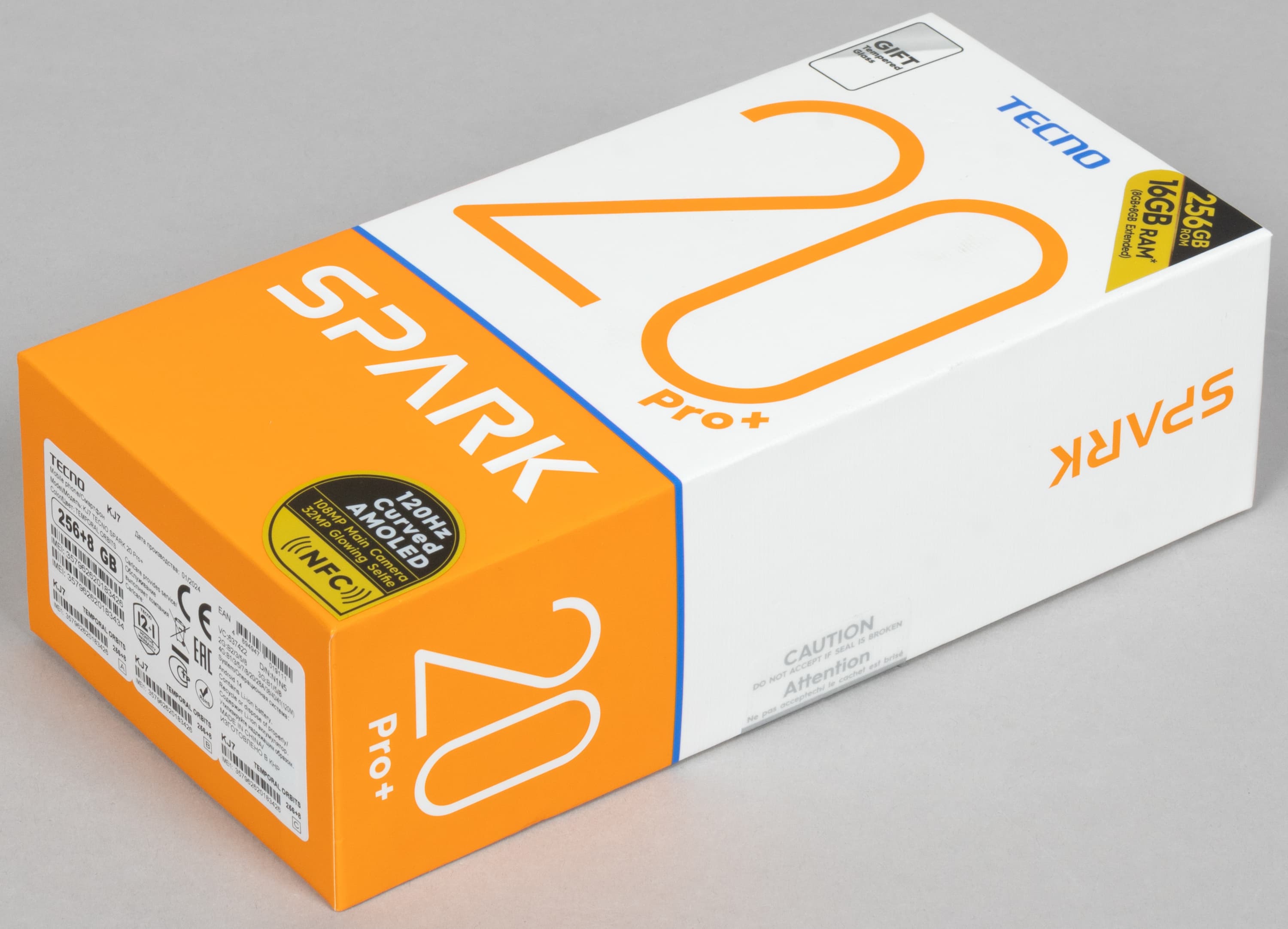 Смартфон Tecno Spark 20 Pro+ поставляется в твердой картонной упаковке с ярким оформлением.