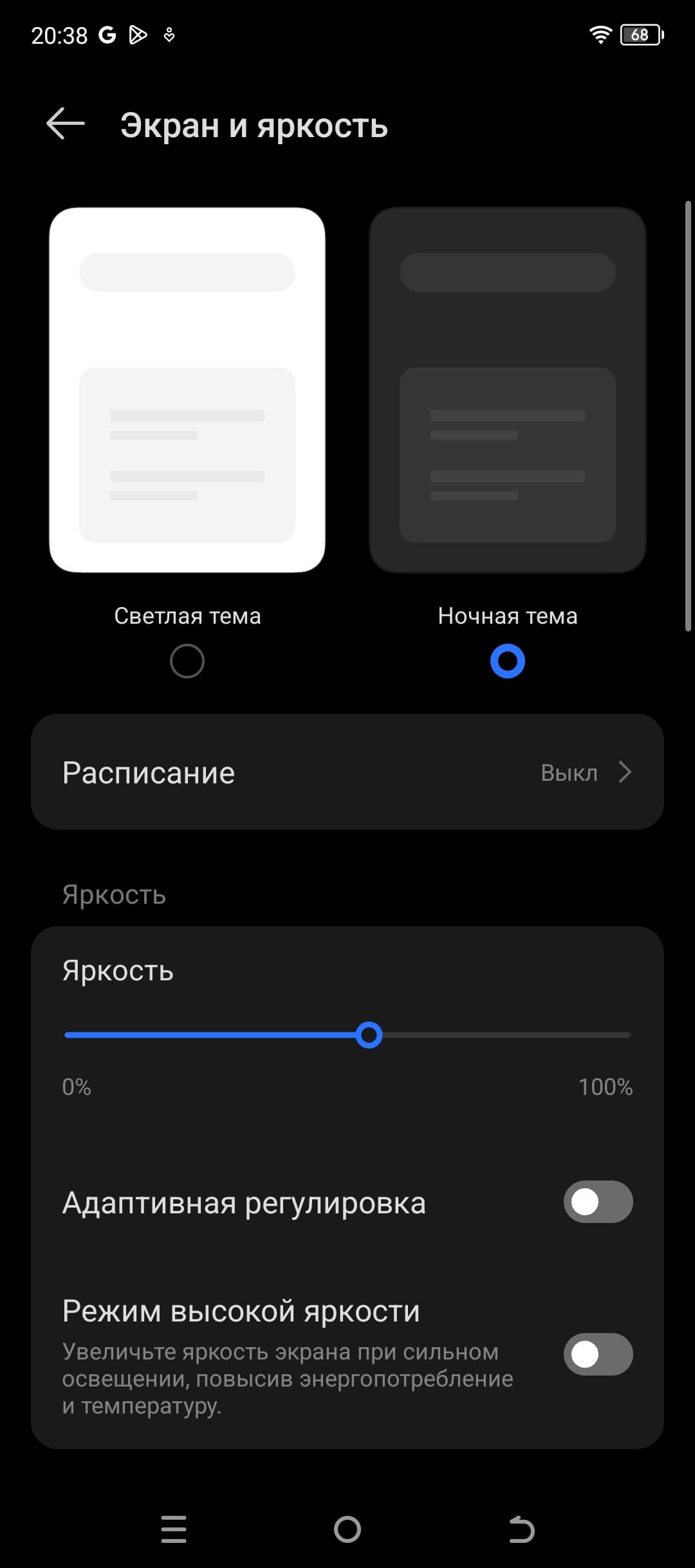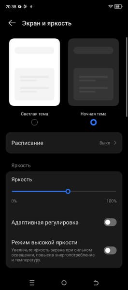 При ручном управлении яркостью и при выводе белого поля во весь экран максимальное значение яркости составило примерно 520 кд/м² в обычных условиях, на очень ярком свету при включенной опции Режим высокой яркости оно может повышаться до 730 кд/м². В любом случае максимальная яркость очень высокая. В данном случае чем меньше площадь белого на экране, тем он светлее, то есть фактическая максимальная яркость белых участков будет почти всегда еще выше. В итоге, учитывая отличные антибликовые свойства, читаемость днем на солнце, должна быть на приемлемом уровне, а темная тема не только экономит заряд аккумулятора, но способствует лучшей разборчивости информации на экране в условиях высокой освещенности. Минимальное значение яркости при ручном управлении — 2 кд/м², то есть пониженный уровень яркости без проблем позволяет использовать устройство даже в полной темноте. Есть автоматическая регулировка яркости по датчику освещенности (он расположен под экраном в верхней части справа от центра по горизонтали). В автоматическом режиме при изменении внешних условий освещенности яркость экрана как повышается, так и понижается. Работа этой функции зависит от положения ползунка регулировки яркости: им пользователь может попытаться выставить желаемый уровень яркости в текущих условиях. Если оставить все по умолчанию, то в полной темноте функция автояркости уменьшает яркость до 8 кд/м² (темновато), в условиях освещенного искусственным светом офиса (примерно 550 лк) устанавливает на 210 кд/м² (нормально), а условно под прямыми лучами солнца повышает до 520 кд/м² (до максимума, так и нужно). Результат нас не устроил, поэтому в полной темноте мы увеличили яркость до 15 кд/м², получив для трех условий, указанных выше, следующие значения: 15, 200, 520 кд/м² (что и было нужно). Получается, что функция автоподстройки яркости работает адекватно и в какой-то степени позволяет пользователю настраивать свою работу под индивидуальные требования.