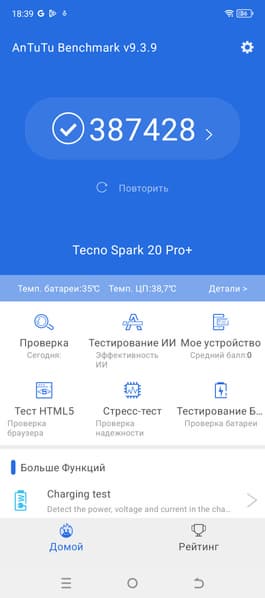 Смартфон Tecno Spark 20 Pro+ получил батарею со стандартным по сегодняшним меркам объемом 5000 мА·ч. В тестах аппарат демонстрирует невысокий уровень автономности.