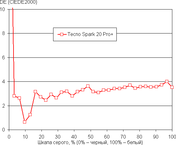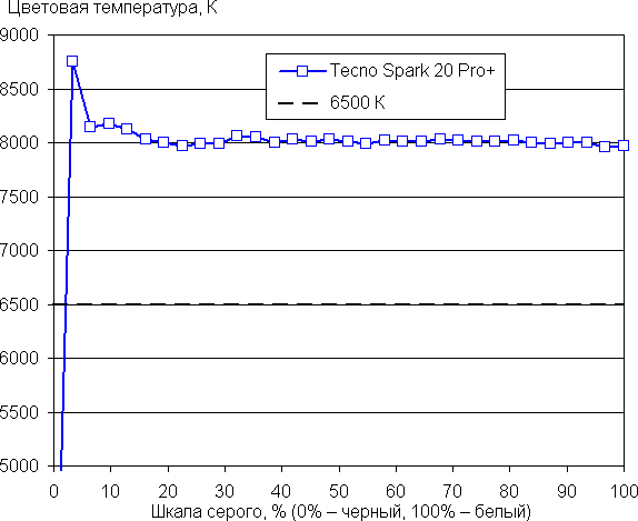 Баланс оттенков на шкале серого компромиссный, так как цветовая температура заметно выше стандартных 6500 К, но отклонение от спектра абсолютно черного тела (ΔE) меньше 10 единиц, что для потребительского устройства считается хорошим показателем. При этом цветовая температура и ΔE мало изменяются от оттенка к оттенку — это положительно сказывается на визуальной оценке цветового баланса. (Самые темные области шкалы серого можно не учитывать, так как там баланс цветов не имеет большого значения, да и погрешность измерений цветовых характеристик на низкой яркости большая.)