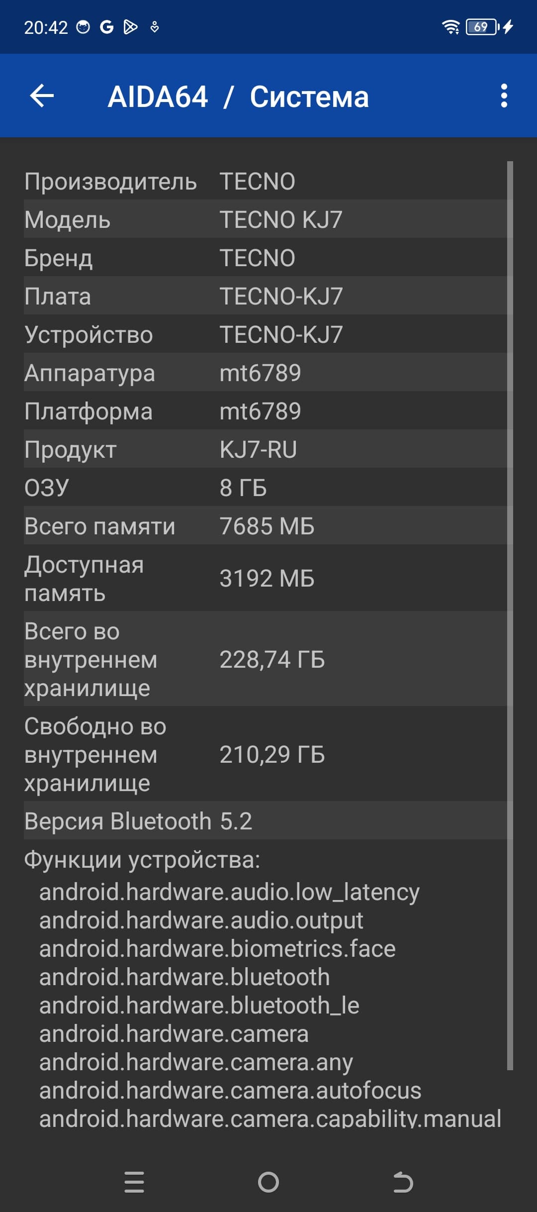 У смартфона Tecno Spark 20 Pro+ стандартные сетевые возможности. Поддерживается большинство диапазонов мобильных сетей 4G, два диапазона Wi-Fi 5 и Bluetooth 5.2, есть поддержка NFC. Не поддерживаются сети 5G и нет поддержки e-SIM. На практике в пределах городской черты московского региона аппарат демонстрирует уверенную работу в беспроводных сетях, не теряет связь, быстро восстанавливает связь после вынужденного обрыва. Все необходимые встроенные датчики, вплоть до гироскопа, на месте.