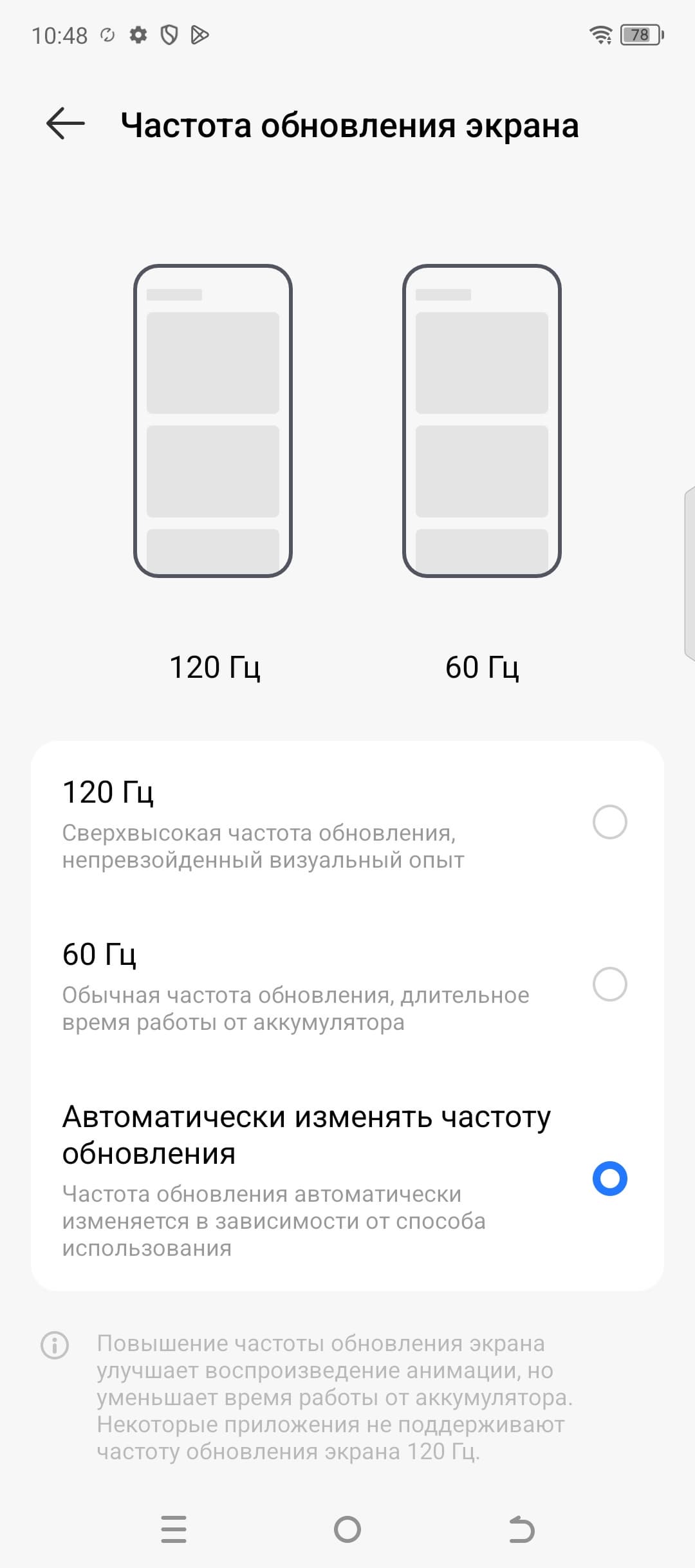 В настройках экрана можно включить режим с повышенной до 120 Гц частотой обновления: