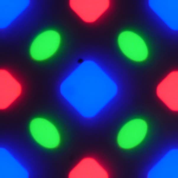 В этом экране используется матрица AMOLED — активная матрица на органических светодиодах. Полноцветное изображение создается с помощью субпикселей трех цветов — красного (R), зеленого (G) и синего (B), но красных и синих субпикселей в два раза меньше, что можно обозначить как RGBG. Это подтверждается фрагментом микрофотографии: